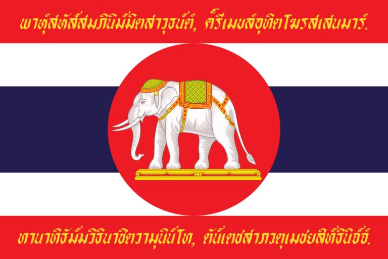 Keywords: War flag of Thailand (World War I-Obverse).svg Cleanup image Needs a better font See https //i ytimg com/vi/CIakhxHLgL4/hqdefault jpg this picture of the original flag for example Obverse side of War flag of Siam now Thailand This flag was designed by King Vajiravudh died 1925 for encouraging Thai troops who fought with Allied Power against the Central Powers during World War I The obverse of the flag is 2 3 like the modern flag of Thailand Triranga but defaced with a red circle The circle edge coincides with the inner rim of the red stripes In the center of red circle there is a dressed white elephant The elephant is facing the flagstaff This flag is not in use now <br /> The inscription on the flag is from a poem written in Pali assumed to have been written by a Thai monk in the 6th century AD entitled Buddha Jayamangala-gatha or Chant to the Buddha's victories The text in Thai and transcribed is cols <poem> พาหุํสหัส์สมภินิม์มิตสาวุธน์ตํ ค๎รี มขลํอุทิตโฆรส สนมารํ ทานาทิธัม์มวิธินาชิตวามุนิน์โท ตัน์ ตชสาภวตุ มชยสิทธินิจ์จํ </poem> <poem> Bāhuṃ sahassam-abhinimmita sāvudhan taṃ grīmekhalaṃ uditaghora sasenamāraṃ Dānādadhammavidhinā jitavā munindo tan tejasā bhavatu me jayasiddhiniccaṃ </poem> The entire poem can be read on Thai Wikisource พุทธชัยมงคลคาถา modern orthography Thanks for original image from http //www tv5 co th/service/mod/heritage/nation/military/flag/index2 htm Thai Heritage Museum and Xiengyod's Site http //www bloggang com/data/xiengyod/picture/1187382211 jpg http //www bloggang com/data/xiengyod/picture/1187382088 jpg ด้านหน้าของธงชัย ฉลิมพลแห่งกองทัพราชอาณาจักรสยาม ซึ่งพระบาทสม ด็จพระรามาธิบดีศรีสิรินทร มหาวชิราวุธฯ พระมงกุฎ กล้า จ้าอยู่หัว พระราชทานแก่ทหารไทยที่ไปปฏิบัติราชการสงครามในสงครามโลกครั้งที่ ๑ ณ ทวีปยุโรป ภาพธงนี้ ดิมกำหนดให้ ป็นด้านหลัง แต่ มื่อติดกับด้ามธงแล้ว ด้ามธงอยู่ด้านซ้ายของ ืนธงด้านนี้ ดังนั้น ภาพธงนี้จึง ป็นธงด้านหน้าตามหลักสากลนิยม <br /> ลักษณะของธงด้านนี้ ป็นธงขนาดอัตราส่วน ๒ ต่อ ๓ แบบธงไตรรงค์ ตรงกลาง ืนธงมีวงกลมสีแดงกว้างจรดขอบสีแดงด้านนอกของธงไตรรงค์ ในวงกลมมีช้าง ือกยืนแท่นทรง ครื่องยืนอยู่ หันหน้า ข้าหาด้ามธง ขอบสีแดงด้านนอกของ ืนธง จารึกบทย่อของชัยมงคลคาถา พาหุงสหสฺสมภินิมฺมิตสาวุธนฺตํ ครี มขลํอุทิตโฆรส สนมารํ ทานาทิธมฺมวิธินาชิตวามุนินโท ตนฺ ตชสาภวตุ มชยสิทธินิจจํ ปัจจุบันธงนี้ ลิกใช้แล้ว 40px40px40px40px40px Own Tangmo 2007-03-23 insignia <gallery> File War flag of Thailand World War I-Reverse svg Reverse side of the flag </gallery> Colours of the Siamese Expeditionary Force in World War I SVG flags - military of Thailand War flags Thailand Flags with elephants Inscribed flags SVG flags - historical of Thailand Elephants in Thai heraldry White elephants Pali language