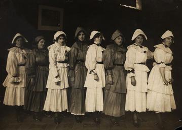Keywords: nurses first world war firstworldwar pierrots social history socialhistory black and white photograph blackandwhitephotograph digital image digitalimage archives the nurses of world war one thenursesofworldwarone ww1 world war one worldwarone wartime conflict women entertainment uplifting interesting unusual inspiring fascinating poignant costume sisters christmas performance christmasperformance festive season festiveseason christmas 3rd northern general hospital 3rdnortherngeneralhospital sheffield england united kingdom unitedkingdom humorous caring december 1916 december1916 hospital recovery wounded soldiers patients longshaw lodge convalescent home for wounded soldiers longshawlodgeconvalescenthomeforwoundedsoldiers grindleford august 1916-june 1917 august1916june1917 picture frame wall room interior dark light shade window floor shoes dress fabric crease belt hat ribbon mark tear stockings smiling standing together grain darkness lips face attentive eyes flower hand hair show performance christmas across the commons christmasacrossthecommons monochrome black and white This is a photograph of sisters and nurses dressed in costume for a Christmas performance at 3rd Northern General Hospital, Sheffield. The photograph was taken in December 1916 and offers a caring and humorous impression of the women working in the Hospital. Reference: DF.BGS-4-7-1 The photograph is part of a larger collection that shows a rare and intimate glimpse in to the Life of a Wounded Soldier recovering from the horrors of World War One. This particular set of photographs is taken from a collection held at Tyne & Wear Archives capturing the every day lives of the nurses and patients at the 3rd Northern General Hospital, Sheffield and Longshaw Lodge Convalescent Home for Wounded Soldiers, Grindleford, near Sheffield. The photographs were taken between August 1916 and June 1917. A blog about this fascinating collection can been viewed here on the Tyne & Wear Archives & Museums website. (Copyright) We're happy for you to share these digital images within the spirit of The Commons. Please cite 'Tyne & Wear Archives & Museums' when reusing. Certain restrictions on high quality reproductions and commercial use of the original physical version apply though; if you're unsure please email archives@twmuseums.org.uk This is a photograph of sisters and nurses dressed in costume for a Christmas performance at 3rd Northern General Hospital, Sheffield. The photograph was taken in December 1916 and offers a caring and humorous impression of the women working in the Hospital. Reference: DF.BGS-4-7-1 The photograph is part of a larger collection that shows a rare and intimate glimpse in to the Life of a Wounded Soldier recovering from the horrors of World War One. This particular set of photographs is taken from a collection held at Tyne & Wear Archives capturing the every day lives of the nurses and patients at the 3rd Northern General Hospital, Sheffield and Longshaw Lodge Convalescent Home for Wounded Soldiers, Grindleford, near Sheffield. The photographs were taken between August 1916 and June 1917. A blog about this fascinating collection can been viewed here on the Tyne & Wear Archives & Museums website. (Copyright) We're happy for you to share these digital images within the spirit of The Commons. Please cite 'Tyne & Wear Archives & Museums' when reusing. Certain restrictions on high quality reproductions and commercial use of the original physical version apply though; if you're unsure please email archives@twmuseums.org.uk
