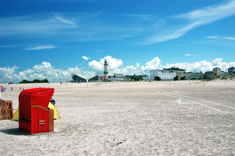 Keywords: warnemünde beach beach chair sand beach lighthouse baltic sea clouds