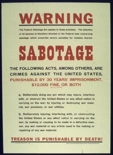 Keywords: "WARNING...SABOTAGE. THE FOLLOWING ACTS, AMONG OTHERS, ARE CRIMES AGAINST THE UNITED STATES...TREASON IS PUNISHABLE... - NARA - 516041.tif Scope and content General notes 516041 Local identifier 44-PA-2315 Office for Emergency Management Office of War Information Domestic Operations Branch Bureau of Special Services 03/09/1943 - 09/15/1945 Still Picture Records Section Special Media Archives Services Division NWCS-S National Archives at College Park 8601 Adelphi Road College Park MD 20740-6001 1941 - 1945 Record group Record Group 44 Records of the Office of Government Reports 1932 - 1947 Record group ARC 373 World War II Posters compiled 1942 - 1945 Series ARC 513498 File unit File unit ARC Variant control numbers NAIL Control Number NWDNS-44-PA-2315 yes Other versions <gallery> File WARNING SABOTAGE _THE_FOLLOWING_ACTS _AMONG_OTHERS _ARE_CRIMES_AGAINST_THE_UNITED_STATES TREASON_IS_PUNISHABLE _-_NARA_-_516041 tif tif File WARNING SABOTAGE _THE_FOLLOWING_ACTS _AMONG_OTHERS _ARE_CRIMES_AGAINST_THE_UNITED_STATES TREASON_IS_PUNISHABLE _-_NARA_-_516041 jpg jpg </gallery> NARA-cooperation PD-USGov World War II posters from the United States Sabotage NARA TIF images with categorized JPGs |