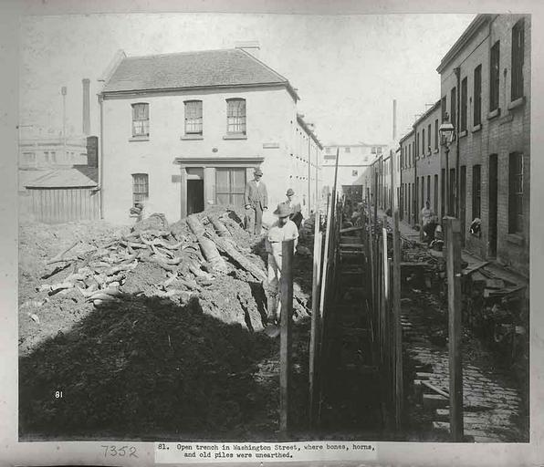 | Keywords: archives state records nsw staterecordsnsw newsouthwales blackandwhite the rocks therocks sydney plague bubonic plague bubonicplague workers people trench ditch rubbish houses john degotardi jr. johndegotardijr photo border black and white From a series of images showing the areas in Sydney affected by the outbreak of Bubonic Plague in 1900. Taken by Mr. John Degotardi, Jr., photographer from the Department of Public Works, the images depict the state of the houses and 'slum' buildings at the time of the outbreak and the cleansing and disinfecting operations which followed. Open trench in Washington Street, where bones, horns, and old piles were unearthed, Sydney Dated: c. 17/07/1900 Digital ID: 12487_a021_a021000027 Rights: www.records.nsw.gov.au/about-us/rights-and-permissions We'd love to hear from you if you use our photos. Many other photos in our collection are available to view and browse on our website using Photo Investigator. From a series of images showing the areas in Sydney affected by the outbreak of Bubonic Plague in 1900. Taken by Mr. John Degotardi, Jr., photographer from the Department of Public Works, the images depict the state of the houses and 'slum' buildings at the time of the outbreak and the cleansing and disinfecting operations which followed. Open trench in Washington Street, where bones, horns, and old piles were unearthed, Sydney Dated: c. 17/07/1900 Digital ID: 12487_a021_a021000027 Rights: www.records.nsw.gov.au/about-us/rights-and-permissions We'd love to hear from you if you use our photos. Many other photos in our collection are available to view and browse on our website using Photo Investigator. |