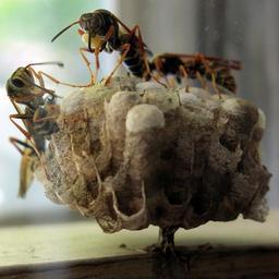 Keywords: Wasps Building Nest 01.jpg Paper wasps building a nest Picture was taken upside down to better orient viewing to the detail of the wasps Own 2005-07-14 Malchata Unidentified Vespidae Black and yellow wasps Wasp nests