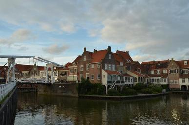 Keywords: water bridge drawbridge house building architecture city evening twilight enkhuizen netherlands
