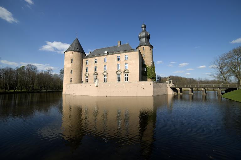 Keywords: water lake castle tower gemen borken westfalen blue middle ages knights castle wall wide