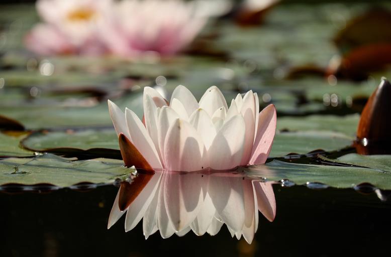 Keywords: water lily flower blossom bloom flowers pink mirroring water
