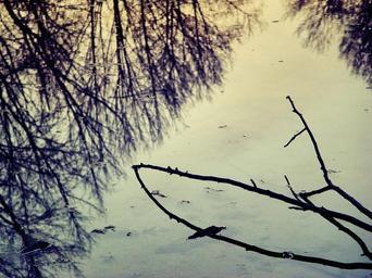 Keywords: water reflection sky winter branch trees sunset light
