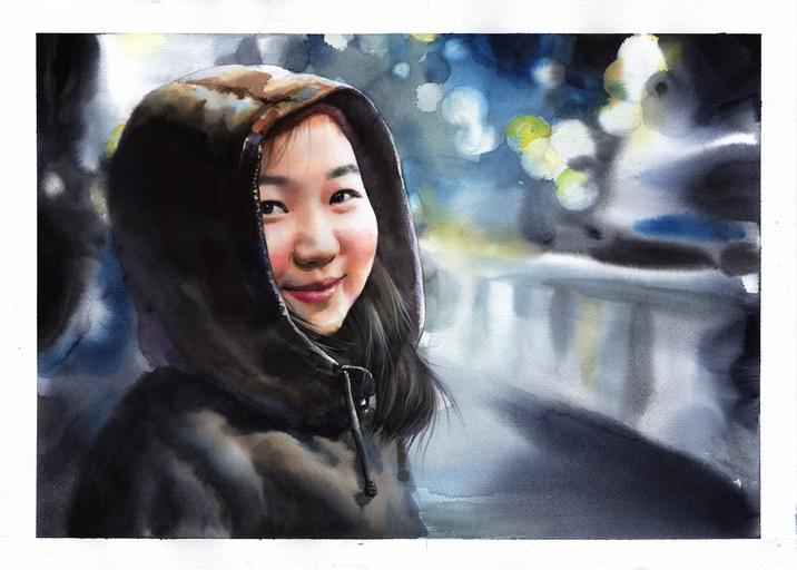 Keywords: watercolor watercolor portrait portraits figure women's cast weight girl hood street cold
