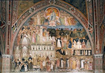 Keywords: Way-of-salvation-church-militant-triumphant-andrea-di-bonaiuto-1365.jpg Santa Maria Novella Florence Created by Andrea di Bonaiuto Andrea da Firenze it is also known as the Triumph of the Church the Church Militant and Triumphant Allegory of the Active and Triumphant Church and the Dominican order among other titles The black-cloaked figures are Dominican priests the Blackfriars the Order of Preachers O P and the black-and-white dogs are their symbol Founded by St Dominic to preach against heresies they were referred to as domini canes hounds of God In the left foreground there is a group of about five dozen figures representing Christendom and illustrating the religious and secular hierarchies At the center are pope and emperor and at their feet are black-and-white dogs protecting the sheep The secular figures range from the emperor down to beggars and cripples Behind them is the great Florentine Duomo representing the Church In the right foreground are three Dominican saints Their identification varies among sources St Peter Martyr sends the dogs to round up lost sheep and fight off wolves St Dominic preaches to the people while St Thomas debates heretics Behind the preachers in the right middleground there is a group of worldly pleasure-seekers above Thomas and the heretics and two more Dominican figures above St Peter and St Dominic The faithful are being blessed and ushered to the gate of Heaven where St Peter welcomes them Above all is a scene of Christ in Majesty with the emblems of the Evangelists The overall composition with the heretics on the right and faithful on the left echoes many more conventional Judgment scenes College of St Rose http //library strose edu/visual_resources Creator Andrea di Bonaiuto 1365-67 PD-old-100-1923 Smaller version less detail more contrast; WGA version; smaller blurry version Cappellone degli Spagnoli - Via Veritas Religious allegories Dominicans Dogs in art Santa Maria del Fiore Florence - Facade |