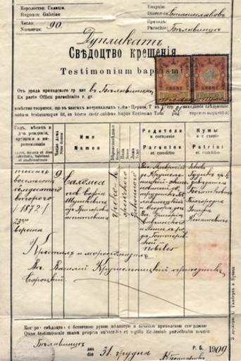 Keywords: Web fck.jpg en The certificate on christening of Krushelnitska ru Свидетельство о к ещении Саломеи К ушельницкой http //salomeamuseum lviv ua/info/excursion-1/ author 1872 PD-old Solomiya Krushelnytska