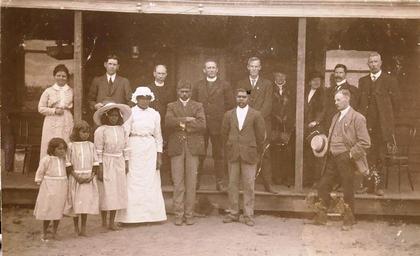 Keywords: katanning western australia westernaustralia aboriginal reserve aboriginalreserve vintage perth a lock alock missionary bride groom wedding seamstress Written on reverse: "This is the first wedding that took place on the new native settlement. The bride was very clever at sewing. She made over 60 new garments and her wedding clothes, also her dress. We miss her very much from the home. Give my love to your mother and sister. Wishing you all a very bright and happy Christmas and prosperous New Year. Love from A. Lock" Miss Lock was the missionary to the aborigines in the district and that could be her standing at the back on the left. Written on reverse: "This is the first wedding that took place on the new native settlement. The bride was very clever at sewing. She made over 60 new garments and her wedding clothes, also her dress. We miss her very much from the home. Give my love to your mother and sister. Wishing you all a very bright and happy Christmas and prosperous New Year. Love from A. Lock" Miss Lock was the missionary to the aborigines in the district and that could be her standing at the back on the left. |