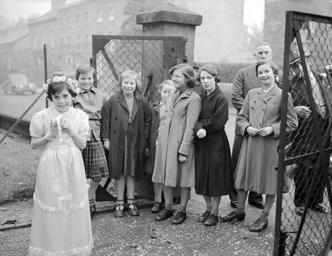 <b>Nodyn/Note:</b> Image shows one of the bridesmaids at the church gate with other children.