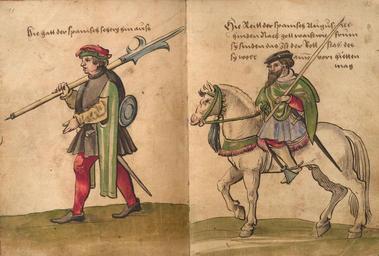 Keywords: Weiditz Trachtenbuch 031-032.jpg Trachtenbuch des Christoph Weiditz Germanisches Nationalmuseum Nürnberg Hs 22474 Bl 31 “32 Spanischer Scherge / Spanischer Polizeidiener alguacil http //dlib gnm de/item/Hs22474 manipuliert um das Buch in Doppelseiten anzuzeigen s 1530 Creator Christoph Weiditz PD-old-100 Trachtenbuch des Christoph Weiditz Police of Spain Halberds in art |