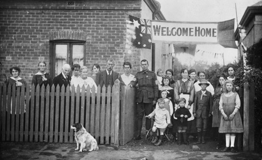 Keywords: australian war memorial australianwarmemorial blackandwhite monochrome black and white ID number: P05328.001 Photographer: Unknown Date Made: July - August 1919 Adelaide, South Australia: Group portrait of 540 Sapper Arthur Findon Dunbar MM, 2nd Australian Tunnelling Company (in uniform with his arm resting on gate) and his family members gathered outside their house at 45 Chief Street, Brompton, SA. The gateway has been decorated overhead with a sign that reads 'Welcome Home' and an Australian flag. Among the children in the front rows, a little boy stands beside his tricycle and a brown and white dog sits in front of the fence. A blacksmith prior to enlistment on 29 September 1915, Sapper Dunbar was awarded the Military Medal (MM) in 1918. His citation stated "During the operations against the Hindenburg Line on the morning of 29th September, in the neighbourhood of Bellicourt, he was engaged with a party searching for enemy mines. Sapper Dunbar removed several dangerous booby traps from dugouts and assisted in the capture of many prisoners. He also detected and removed a large number of road mines. The whole of the day he worked under heavy shell and machine gun fire, during which 50 of his party became casualties". Sapper Dunbar returned to Australia in June 1919 and was discharged on 25 August Rights Info: No known copyright restrictions. This photograph is from the Australian War Memorial's collection www.awm.gov.au Persistent URL: www.awm.gov.au/collection/PB05328.001 ID number: P05328.001 Photographer: Unknown Date Made: July - August 1919 Adelaide, South Australia: Group portrait of 540 Sapper Arthur Findon Dunbar MM, 2nd Australian Tunnelling Company (in uniform with his arm resting on gate) and his family members gathered outside their house at 45 Chief Street, Brompton, SA. The gateway has been decorated overhead with a sign that reads 'Welcome Home' and an Australian flag. Among the children in the front rows, a little boy stands beside his tricycle and a brown and white dog sits in front of the fence. A blacksmith prior to enlistment on 29 September 1915, Sapper Dunbar was awarded the Military Medal (MM) in 1918. His citation stated "During the operations against the Hindenburg Line on the morning of 29th September, in the neighbourhood of Bellicourt, he was engaged with a party searching for enemy mines. Sapper Dunbar removed several dangerous booby traps from dugouts and assisted in the capture of many prisoners. He also detected and removed a large number of road mines. The whole of the day he worked under heavy shell and machine gun fire, during which 50 of his party became casualties". Sapper Dunbar returned to Australia in June 1919 and was discharged on 25 August Rights Info: No known copyright restrictions. This photograph is from the Australian War Memorial's collection www.awm.gov.au Persistent URL: www.awm.gov.au/collection/PB05328.001 |