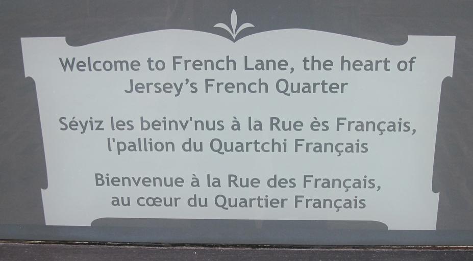 | Keywords: Welcome to French Lane Saint Helier Jersey.jpg Welcome to French Lane the heart of Jersey's French Quarter Séyiz les beinv'nus à la Rue ès Français l'pallion du Quartchi Français self-photographed 2010-09-15 Man vyi Own work all rights released Public domain Saint Helier Jersey Hilgrove Street Saint Helier Multilingual signs in Jersey Welcome signs in Jersey Jèrriais Tourist signs | ||||