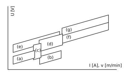 Keywords: Welding-metaltransfer-scheme.svg en Modes of Metal Transfer in U-I chart cs Druhy přenosu kovu v závislosti na svařovacích parametrech I a U own Alu cz 2010-10-28 vysvětlivky a zkratový oblouk b zrychlený zkratový oblouk c přechodový oblouk d sprchový oblouk e impulsní oblouk f moderovaný sprchový oblouk g rotující oblouk Welding diagrams |