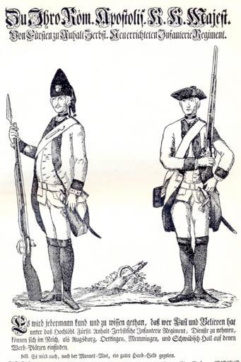 Keywords: Werbeplakat 1749.png Werbeplakat um 1740 Der Text lautet Zu Ihro Röm Apostolis K K Majest / Von Fürsten zu Anhalt Zerbst Neuerrichteten Infanterie Regiment / Es wird jedermann kund und zu wissen gethan daß wer Lust und Belieben hat/ unter das Hochlöbl Fürstl Anhalt-Zerbstische Infanterie Regiment Dienste zu nehmen / können sich im Reich als Augsburg Oettingen Memmingen und Schwäbisch-Hall auf denen/ Werb-Plätzen einfinden / NB Es wird auch nach der Mannes-Mas ein gutes Hand-Geld gegeben Liebe Der Soldat in der deutschen Vergangenheit 1899 circa 1740 PD-old-100 Military history of Germany Deutsches Heer Military recruitment posters 18th-century advertisements |