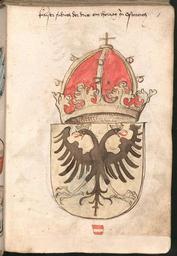 Keywords: Wernigeroder Wappenbuch 023.jpg žWernigeroder Schaffhausensches Wappenbuch ; Süddeutschland 4 Viertel 15 Jh <br />Bayerische Staatsbibliothek München Cod icon 308 n<br /> Wappen ideeller Vorfahren und Wappen höchster weltlicher und geistlicher Würdenträger Kaiser Friedrich III Herzog von Österreich http //daten digitale-sammlungen de/~db/0004/bsb00043104/images/ circa 1475 “1500 anonymous PD-old Wernigeroder Wappenbuch Coats of arms of Frederick III Holy Roman Emperor Or shield coats of arms of Holy Roman Emperors |