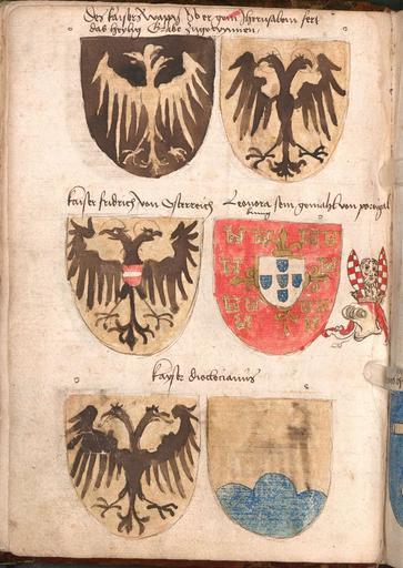 Keywords: Wernigeroder Wappenbuch 044.jpg žWernigeroder Schaffhausensches Wappenbuch ; Süddeutschland 4 Viertel 15 Jh <br />Bayerische Staatsbibliothek München Cod icon 308 n<br /> Wappen Kaiser Friedrich III und Eleonora von Portugal http //daten digitale-sammlungen de/~db/0004/bsb00043104/images/ circa 1475 “1500 anonymous PD-old ImageNote 1 208 770 558 568 1500 2115 2 Kaiser Friedrich III von Österreich ImageNoteEnd 1 ImageNote 2 791 763 558 583 1500 2115 2 Eleonore von Portugal seine Gemahlin ImageNoteEnd 2 Wernigeroder Wappenbuch Attributed arms Coats of arms of Frederick III Holy Roman Emperor Coats of arms of Eleanor of Portugal 1434-1467 Royal coats of arms of Portugal Order of Aviz cross in heraldry Coats of arms of the House of Aviz Roundels in the Wernigeroder Wappenbuch |