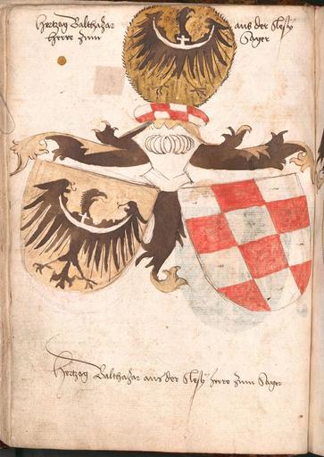 Keywords: Wernigeroder Wappenbuch 068.jpg žWernigeroder Schaffhausensches Wappenbuch ; Süddeutschland 4 Viertel 15 Jh <br />Bayerische Staatsbibliothek München Cod icon 308 n<br /> Wappen des Herzog Balthasar von Schlesien http //daten digitale-sammlungen de/~db/0004/bsb00043104/images/ circa 1475 “1500 anonymous PD-old Wernigeroder Wappenbuch Coats of arms of Duchy of Sagan Coats of arms of the House of Piast Balthasar of Zágán |