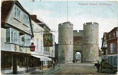 | Keywords: West Gate Towers 005.jpg Tinted or overpainted photograph postcard of Westgate Towers Canterbury Kent England postmarked 1905 At this time the gaol was closed and the towers contained Council files The museum was not to be opened until 1908 but museum exhibits today cover the earlier history of the building My own scan of actual postcard 1905 Edward Crow died 1908 aged 59 PD-old-70-1923 Canterbury West Gate | ||||