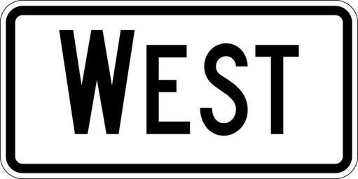 Keywords: West plate.svg 600 mm by 300 mm 24 in by 12 in west plate made to the specifications of the http //mutcd fhwa dot gov/SHSm/Guide pdf 2004 edition of Standard Highway Signs sign M3-4 Uses the http //www triskele com/fonts/index html Roadgeek 2005 fonts United States law does not permit the copyrighting of typeface designs and the fonts are meant to be copies of a U S Government-produced work anyway The outside border has a width of 1 1 mm and a color of black so it shows up; in reality signs have no outside border own Ltljltlj User Ltljltlj/Template M3-4 - Cardinal Direction Auxiliary Diagrams of black and white road signs |