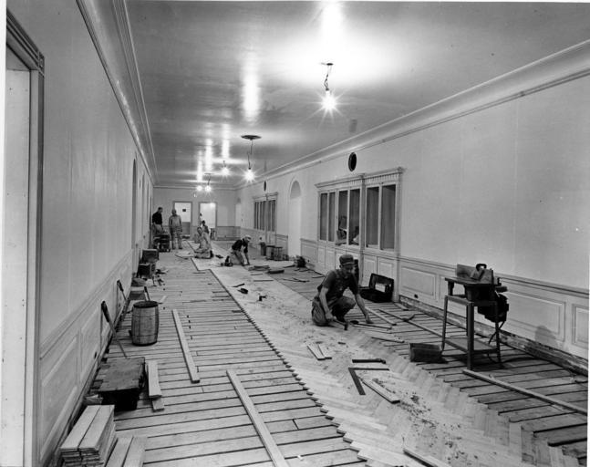 Keywords: u.s. national archives usnationalarchives harry s. truman library harrystrumanlibrary nara:arcid=6993212 blackandwhite monochrome hall black and white Original Caption: West View in the Third Floor Corridor of the White House during the Renovation, 12/04/1951 Created By: National Archives and Records Administration. Office of Presidential Libraries. Harry S. Truman Library. (04/01/1985 - ) From: Series: Photographs Relating to the Administration, Family, and Personal Life of Harry S. Truman, compiled 1957 - 2004, documenting the period 1849 - 2004 Contact: Harry S. Truman Library (NLHST), 500 West U.S. Highway 24, Independence, MO, 64050-1798. PHONE: 816-268-8272; FAX: 816-268-8295; EMAIL:truman.reference@nara.gov. Production Dates: 12/04/1951 Scope and Content Note: West view of the third floor corridor of the White House during the renovation. Carpenters are laying finish floor of red oak in herring-bone design over sub-flooring. Persistent URL: arcweb.archives.gov/arc/action/ExternalIdSearch?id=6993212 Truman Library URL: www.trumanlibrary.org/photographs/view.php?id=19099 Access Restrictions: Unrestricted Use Restrictions: Unrestricted Original Caption: West View in the Third Floor Corridor of the White House during the Renovation, 12/04/1951 Created By: National Archives and Records Administration. Office of Presidential Libraries. Harry S. Truman Library. (04/01/1985 - ) From: Series: Photographs Relating to the Administration, Family, and Personal Life of Harry S. Truman, compiled 1957 - 2004, documenting the period 1849 - 2004 Contact: Harry S. Truman Library (NLHST), 500 West U.S. Highway 24, Independence, MO, 64050-1798. PHONE: 816-268-8272; FAX: 816-268-8295; EMAIL:truman.reference@nara.gov. Production Dates: 12/04/1951 Scope and Content Note: West view of the third floor corridor of the White House during the renovation. Carpenters are laying finish floor of red oak in herring-bone design over sub-flooring. Persistent URL: arcweb.archives.gov/arc/action/ExternalIdSearch?id=6993212 Truman Library URL: www.trumanlibrary.org/photographs/view.php?id=19099 Access Restrictions: Unrestricted Use Restrictions: Unrestricted |