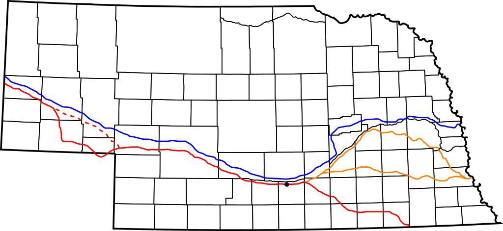 Keywords: Western Trails in Nebraska.svg Western trails in Nebraska Blue Mormon Trail; red Oregon Trail/California Trail/Pony Express; dashed red Oregon Trail/California Trail; orange lesser-used trail routes; black dot Fort Kearny self-made Trails adapted from http //www nebraskatransportation org/maps/state-map/current/pdf/front pdf Nebraska Department of Roads highway map 2008-03-31 Swid History of Nebraska Maps of Nebraska Mormon Trail Oregon Trail Trails in the United States Pony Express Maps related to Mormonism |