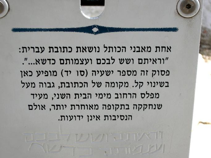 Keywords: Western Wall3358.JPG Old Jerusalem Western Wall The Isaiah Stone located under Robinson's Arch has a carved inscription in Hebrew from Isaiah 66 14 וראית ושש בכ ועצמותיכ כדשא תפרחנה And when ye see this your heart shall rejoice and your bones shall flourish like an herb אחת מאבני הכות נושאת כתובת עברית וראית ושש בכ ועצמות כדשא פסוק זה מספר ישעיה סו יד מופיע כאן בשינוי ק מקומה ש הכתובת גבוה מע מפ ס הרחוב מימי הבית השני מעיד שנחקקה בתקופה מאוחרת יותר או הנסיבות אינן ידועות own self taken 3 4 2009 Yoav Dothan Own work all rights released Public domain <gallery> File Jerusalem Western Wall Isaiah verse jpg File Jerusalem Western Wall Isaiah verse closeup jpg File Western Wall3358 JPG File Jerusalem Mount of Olives Jericho road Wall Isaiah verse jpg </gallery> Western Wall Ancient graffiti in Israel Ancient Hebrew inscriptions Book of Isaiah Jerusalem Archaeological Park ImageNote 1 242 2088 2845 638 3648 2736 2 copy of the engraved text <br> וראית ושש בכ <br> ועצמות כדשא ImageNoteEnd 1 |