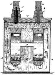 | Keywords: Westoncell Volt.png en Extracted from PDF revealing US patent 494 827 A Outer shell or casing made preferably of sheet brass elliptical in form B Wooden block containing cavities or recesses to receive the glass cells C C' C C' Glass cells consist of two cylindrical vessels connected by a transverse tube D E Piece of muslin or other suitable cloth F Cork pierced with apertures G H Connecting wires I Copper wires connected to H J Suitable binding posts provided with covering caps L K Cover of the shell A which is made of rubber M Suitable stoppers inserted in the mouths of the cell 2012-03-27 www google com/patents/US494827 pdf Edward Weston died 20-Aug-1936 <gallery showfilename> File Westoncell Volt jpg </gallery> PD-old Uploaded with UploadWizard Edward Weston chemist History of electric batteries |