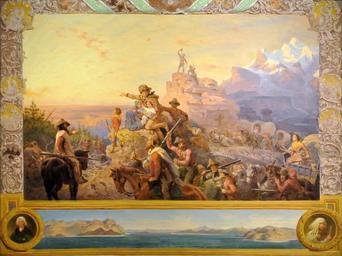 Keywords: Westward (Leutze).JPG Artwork Creator Emanuel Leutze Westward the Course of Empire Takes Its Way preliminary study for a mural in the U S Capitol Emanuel Gottlieb Leutze May 24 1816 “ July 18 1868 was a German-American history painter best known for his painting Washington Crossing the Delaware 1851 In 1860 he was commissioned by the U S Congress to decorate a stairway in the Capitol Building in Washington D C for which he painted this preliminary study for the large composition Westward the Course of Empire Takes Its Way also commonly known as Westward Ho It celebrates the idea of the Manifest Destiny at the time when the Civil War threatened the Republic 1861 oil on canvas in 33 25 43 375 Institution Smithsonian American Art Museum object history exhibition history credit line Smithsonian American Art Museum Bequest of Sara Carr Upton accession number 1931 6 1 photo by James Steakley 14569 <gallery> Emanuel Leutze - Westward the Course of Empire Takes Its Way - Capitol jpg Completed mural in Capitol</gallery> 38 53 51 61 N 77 1 20 4 W scale 391_region US PD-Art-100 Westward the Course of Empire Takes Its Way |