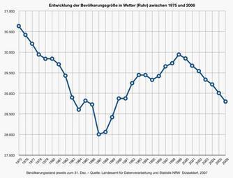 Keywords: Wetter Population.gif Bevölkerungsstand Wetter Ruhr Statistik 1970-heute png Entwicklung der Einwohnerzahl in Wetter Ruhr zwischen 1975 und 2006 Landesamt für Datenverarbeitung und Statistik NRW Düsseldorf 2007 2007-09-21 Schwelmer Statistics of Wetter Ruhr Temporal population graphs of Ennepe-Ruhr-Kreis |