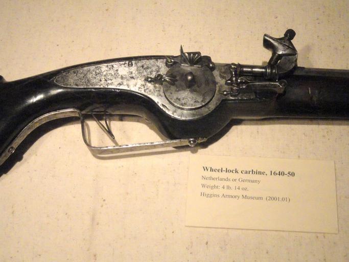 Keywords: Wheel-lock carbine, Netherlands or Germany, 1640-1650 - Higgins Armory Museum - DSC05621.JPG Exhibit in the Higgins Armory Museum 100 Barber Avenue Worcester Massachusetts USA The museum permitted photography without any restriction both in writing and when I asked verbally I took this photograph 2011-09-24 11 53 23 Daderot Public domain Firearms in the Higgins Armory Museum Wheellock |