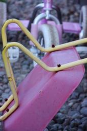 Keywords: wheelbarrow toy bicycle pink yellow rust child girl stone ring yard