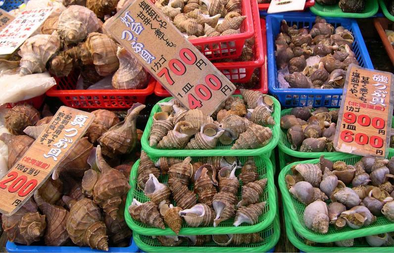 | Keywords: Whelks at a fish market in Japan.jpg Buccinid whelks for sale at a fish market in Japan Left Ma-tsubu Ma legitimate or orthodox Neptunea polycostata Scarlato 1952 for sashimi - 200yen per 100g Middle Tōdai-tsubu Tōdai lighthouse Buccinum inclytum Pilsbry 1904 for boiling - 400yen per green basket 700yen per red Right Iso-tsubu Iso seashore Buccinum middendorffi Verkruzen 1882 for boiling - 600yen per green basket 900yen per blue ja 店に並ぶツブ 左の つぶ はエゾ ラ 中央の 灯台つぶ はヒモマキバイ 右の 磯つぶ はエゾバイ own 2006/June/10 me PD Unidentified Buccinidae Fish markets in Japan Pricing in Japanese Snails as food |