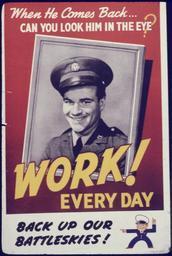 | Keywords: When he comes back... Can you look him in the eye^ Work every day^ Back up our battleskies^ - NARA - 535127.tif Scope and content General notes 535127 Local identifier 179-WP-1276 Office for Emergency Management War Production Board 01/1942 - 11/03/1945 Still Picture Records Section Special Media Archives Services Division NWCS-S National Archives at College Park 8601 Adelphi Road College Park MD 20740-6001 other date circa 1942 1943 Record group Record Group 179 Records of the War Production Board 1918 - 1947 Record group ARC 508 War Production Board compiled 1942 - 1943 Series ARC 533858 File unit File unit ARC Variant control numbers NAIL Control Number NWDNS-179-WP-1276 yes Other versions <gallery> File When_he_comes_back _Can_you_look_him_in_the_eye _Work_every_day _Back_up_our_battleskies _-_NARA_-_535127 tif tif File When_he_comes_back _Can_you_look_him_in_the_eye _Work_every_day _Back_up_our_battleskies _-_NARA_-_535127 jpg jpg </gallery> NARA-cooperation PD-USGov World War II posters from the United States NARA TIF images with categorized JPGs |