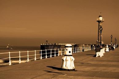 Keywords: whitby lighthouses town promenade city sea architecture background holidays sepia black white season fall water tourism trip coast history england