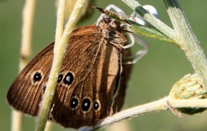 Keywords: white crab spider catching butterfly hunting