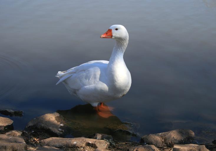 Keywords: white goose standing in water pond fowl beautiful creature long necked forward stones soft