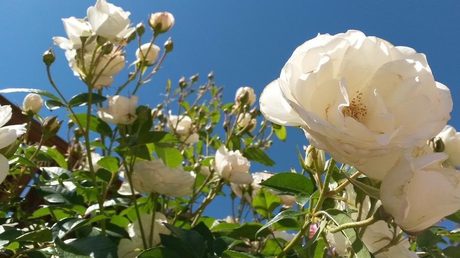 Keywords: white roses sky white roses flower white blue rose sky nature summer romance outdoors spring day plant green