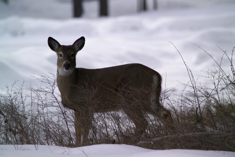 Keywords: white tailed deer doe wildlife nature standing looking snow cold winter forest female portrait head