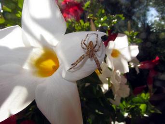 Keywords: white trumpet flower blossom bloom spider close arachnid summer bloom