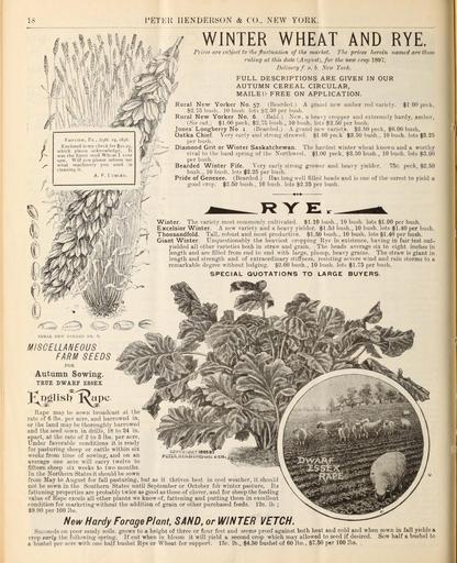 | Keywords: Wholesale price list of requisites for florists and market gardeners (16775355302).jpg S ARE GIVEN IN OUR <br> AUTUMN CEREAL CIRCULAR <br> MAILED FREE ON APPLICATION <br> Rural New Yorker No 57 Bearded A grand new amber red variety 1 00 peck <br> 2 75 bush 10 bush lots 2 50 per bush <br> Rural New Yorker No 6 Bald New a heavy cropper and extremely hardy amber <br> See cut 1 00 peck 2 75 bush 10 bush lots 2 50 per bush <br> Jones' Longberry No I Hoarded A grand new variety 2 50 peek 6 00 bush <br> Oatka Chief Very early and strong strawed 1 00 petk' 3 50 bush 10 bush lots 3 25 <br> per bush <br> Diamond Grit or Winter Saskatchewan The hardest winter wheat known and a worthy <br> rival to the hard spring of the Northwest 1 00 peek 3 50 bush 10 bush lots 3 00 <br> per bush <br> Bearded Winter Fife Very early strong grower and heavy yielder 75c peck 2 50 <br> bush 10 bush lots 2 25 per bush <br> Pride of Genesee Bearded Has long well filled heads and is one of the surest to yield a <br> good crop 2 50 bush 10 bush lots 2 25 per bush <br> Winter The variety most commonly cultivated 1 10 bush 10 bush lots 1 00 per bush <br> Excelsior Winter A new variety and a heavy yielder 1 50 bush 10 bush lots 1 40 per bush <br> Thousandfold Tall robust and most productive 1 50 bush 10 bush lots 1 40 per bush <br> Giant Winter Unquestionably the heaviest cropping Rye in existence having in fair test out- <br> yielded all other varieties both in straw and grain The heads average six to eight inches in <br> length and are filled from end to end with large plump heavy grains The straw is giant in <br> length and strength and of extraordinary stiffness resisting severe wind and rain storms to a <br> remarkable degree without lodging 2 00 bush 10 bush lots 1 75 per bush <br> SPECIAL QUOTATIONS TO LARGE BUYERS <br> £r3 <br> RURAL NEW YORKER NO 6 <br> MISCELLANEOUS <br> FARM SEEDS <br> FOR <br> Autumn Sowing <br> TEDE DWAEF ESSEX <br> Rape may be sown broadcast at the <br> rate of 6 lbs per acre and harrowed in <br> or I he land may be thoroughly harrowed <br> and the seed sown in drills 18 to 24 in <br> apart at the rate of 2 to 3 lbs per acre <br> Under favorable conditions it is ready <br> for pasturing sheep or cattle within six <br> weeks from time of sowing and on an <br> average one acre will carry twelve to <br> fifteen sheep six weeks to two months <br> In the Northern States it should be sown <br> from May to August for fall pasturing but as it thrives best in cool weather it should <br> not be sown in the Southern States until September or October for winter pasture Its <br> fattening properties are probably twice as good as those of clover and for sheep the feeding <br> value of Rape excels all other plants we know of fattening and putting them in excellent <br> condition for marketing without the addition of grain or other purchased feeds 12c lb ; <br> 9 00 per 100 lbs <br> New Hardy Forage Plant SAND or WINTER VETCH <br> Succeeds on poor sandy soils grows to a height of three or four feet and seems proof against both heat and cold and when sown install yields a <br> crop early the following spring If cut when in bloom it will yield a second crop which may allowed to seed if desired <br> a bushel per acre with one half bushel Rye or Wheat for support 15c lb 4 50 bushel of 60 lbs 7 50 per 100 lbs <br> COPYH iSHT IB95BY <br> Sow half a bushel to 45172978 160879 84546 Page 18 Text http //www biodiversitylibrary org/page/45172978 1897 Henderson Peter Co ; Stumpp Walter Co New York N Y Biodiversity Heritage Library Wholesale price list of requisites for florists and market gardeners / 1897-1913 Garden Stories Catalogs Henderson Peter Co New York New York State Nurseries Horticulture Nursery stock Seed industry and trade Seeds Stumpp Walter Co New York N Y Mertz Library The New York Botanical Garden bhl page 45172978 dc identifier http //biodiversitylibrary org/page/45172978 bhlGardenStories Flowers Bulbs Rye English Rape BHLinbloom henderson peter co new york new york state nurseries horticulture stumpp walter co new york n y mertz library the new york botanical garden bhlgardenstories english rape bhlinbloom Information field Flickr posted date ISOdate 2015-03-10 CC-BY-2 0 BioDivLibrary https //flickr com/photos/61021753 N02/16775355302 2015-08-24 21 50 37 cc-by-2 0 PD-old-70-1923 Secale cereale Wholesale price list of requisites for florists and market gardeners 1897 Photos uploaded from Flickr by Fæ using a script |