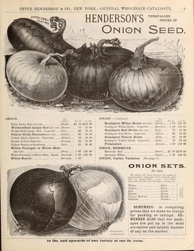 | Keywords: Wholesale price list of requisites for florists and market gardeners (16569153707).jpg PETER HENDERSON CO NEW YORK ” GENERAL WHOLESALE CATALOGUE <br> 9 <br> UNEQUALLED <br> STOCKS OF <br> HENDERSON'S <br> Onion Seed <br> MM <br> m <br> ONION <br> Extra Early Red see cut <br> Wethersfleld Large Red see cut <br> Wethersfield Large Red Imparled <br> Yellow Globe Danvers see cut <br> Yellow Globe Danvers Imported <br> Round Yellow Danvers <br> Yellow Dutch or Strasburg <br> White Portugal or Silver Skin <br> see cut <br> White Portugal or Silver Skin Imptd <br> White Bunch <br> Tel <br> Cipher <br> Dazzle <br> Deacon <br> Daze <br> Debate <br> Debacle <br> Decamp <br> Deck <br> Decoy <br> Decanter <br> Decrease <br> Per lb <br> loo lbs <br> H <br> 10 100 00 <br> 70 <br> 65 00 <br> 60 <br> 55 00 <br> 60 <br> 55 00 <br> 50 <br> 45 00 <br> 55 <br> 50 00 <br> 55 <br> 50 00 <br> 1 <br> 50 <br> 140 00 <br> 1 <br> 40 <br> 130 00 <br> 1 <br> 40 <br> too lbs <br> 140 00 <br> 130 00 <br> 65 00 <br> 55 00 <br> 70 00 <br> 60 00 <br> 110 00 <br> ONION ” Continued Tel <br> Cipher Per lb <br> Southport White Globe see cut Decree 1 <br> Southport White Globe Imported Decretal 1 <br> Southport Red Globe see cut Defy <br> Southport Hed Globe Imported Deface <br> Southport Yellow Globe Delta <br> Southport Yellow Globe Imported Delet <br> Frizetaker Dermis 1 <br> ONION BERMUDA <br> Bermuda Red Desert 1 40 130 00 <br> Bermuda White Depot 1 50 140 00 <br> ONION Italian Varieties See page 8 <br> ONION SETS <br> Net Cash <br> We deliver all Onion Sets into the hands of <br> transportation companies safely packed after <br> that our responsibility ctases Pu chasers <br> must take all risks from freezing or heating etc <br> White Ditch 1 <br> Yellow Ditty <br> Red Divan <br> Potato Divest <br> Top or Button Divide j £ <br> Shallots Division <br> J <br> HRNDKKSON S <br> GLOBE ONIONS <br> REMEMBER in comparing <br> prices that we make no charge <br> for packing or cartage RE- <br> MEMBER ALSO that our pack- <br> ages are put up in the most <br> attractive and salable manner <br> of any on the market <br> io lbs and upwards of one variety at ioo lb rates 45172953 160879 84546 Page 9 Text http //www biodiversitylibrary org/page/45172953 1897 Henderson Peter Co ; Stumpp Walter Co New York N Y Biodiversity Heritage Library Wholesale price list of requisites for florists and market gardeners / 1897-1913 Garden Stories Catalogs Henderson Peter Co New York New York State Nurseries Horticulture Nursery stock Seed industry and trade Seeds Stumpp Walter Co New York N Y Mertz Library The New York Botanical Garden bhl page 45172953 dc identifier http //biodiversitylibrary org/page/45172953 bhlGardenStories Vegetables Onions BHLinbloom henderson peter co new york new york state nurseries horticulture stumpp walter co new york n y mertz library the new york botanical garden bhlgardenstories bhlinbloom Information field Flickr posted date ISOdate 2015-03-10 CC-BY-2 0 BioDivLibrary https //flickr com/photos/61021753 N02/16569153707 2015-08-24 21 55 33 cc-by-2 0 PD-old-70-1923 Onions Wholesale price list of requisites for florists and market gardeners 1897 Photos uploaded from Flickr by Fæ using a script |