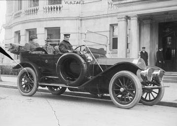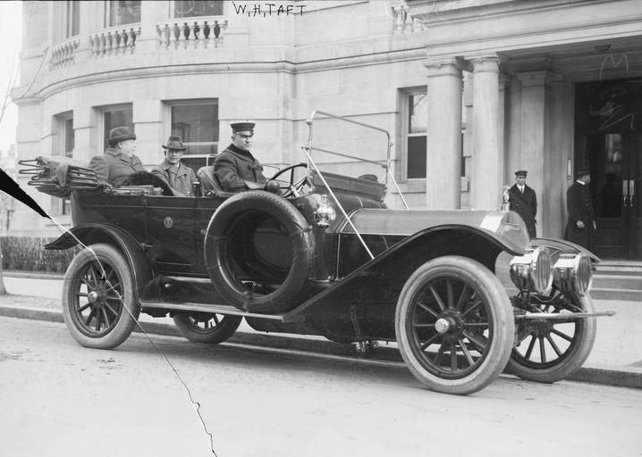 Keywords: WHTaftMotorcar.jpg U S President William Howard Taft seated in back right of the car; at left of photo in his Pierce-Arrow touring car Unidentified man seated next to President Taft The driver is not identified but is likely Taft's official driver George Robinson Bain News Service photograph cracked glass negative via Library of Congress website http //hdl loc gov/loc pnp/ggbain 12970; converted from TIFF to jpg and border cropped before upload ca 1910 Unnamed photographer in employ of Bain News Service PD-Bain 1909 automobiles Presidential automobiles of the United States 1910 Pierce-Arrow automobiles 1909 William Howard Taft Sitting_men |