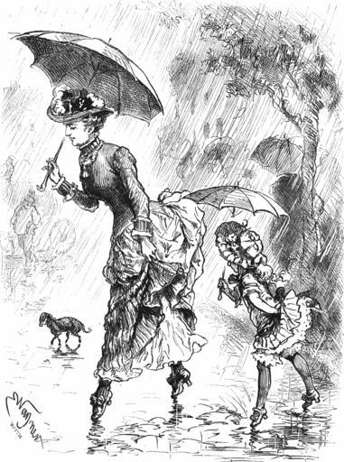 Keywords: Wie dieAlten sungen so zwitfchern dieJungen.png Caption Wie die Alten sungen so zwitschern die Jungen Fliegende Blätter magazine; Band LXXVIII page 6 1881 Erdmann Wagner Wagner Witila PD old The German proverb in the caption could be loosely translated into English as Like mother like daughter or A chip off the old block The little girl is intently mimicking everything the adult woman does including the somewhat balletic foot positions and the scrunching up of the side of the skirts though with the shorter skirt length of the girl's clothes this is not needed to keep the hem of her dress off the wet street as it is for the adult woman's dress PD-old-70-1923 Mother and child in art 1880s fashion Umbrellas in art Rain in art Walking women Proverbs in art 1881 cartoons Erdmann Wagner