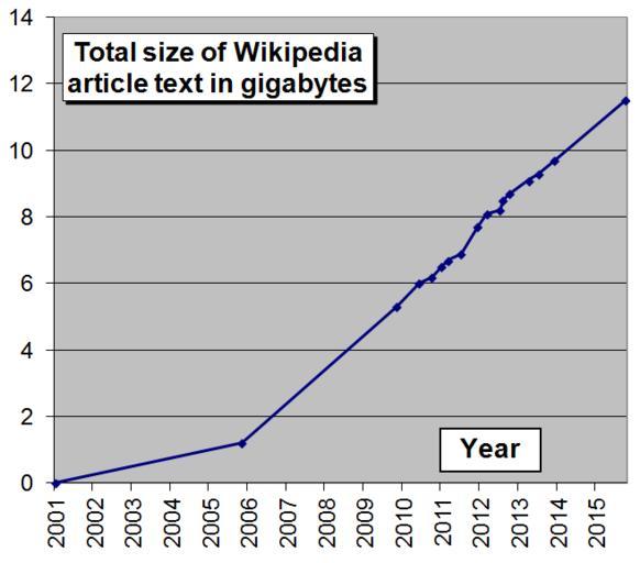 | Keywords: Wikipedia article size in gigabytes.png graph size of Wikipedia measured in size of total article text in English Wikipedia in gigabytes GB compressed own based on en Wikipedia Database download Jan 2001; 0 0 GB Nov 2005; 1 2 GB Nov 2009; 5 3 GB Jun 2010; 6 0 GB Oct 2010; 6 2 GB Jan 2011; 6 5 GB Mar 2011; 6 7 GB Jul 2011; 6 9 GB Dec 2011; 7 7 GB Mar 2012; 8 1 GB Jul 2012; 8 2 GB Aug 2012; 8 5 GB Oct 2012; 8 7 GB Apr 2013; 9 1 GB Oct 2015; 11 5 GB Original excel file can be downloaded from https //docs google com/open id 0B8IdyPbSsy9rWlJDcGlCVUlBODA here Mikael Häggström Originally 2010-07-04 English Wikipedia statistics Line charts Gigabyte |