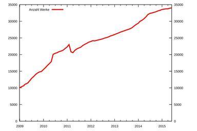 Keywords: Wikisource-werke.svg Anzahl der Werke in der deutschen Wikisource <source lang gnuplot > set term svg size 600 400 font Arial 10 set output 'wikisource-werke svg' set timefmt ' Y- m- d' set xdata time set datafile separator set yrange 0 35000 set y2tics set format x Y set xtics 2008-12-30 31556926 2014-12-30 plot 'werke csv' u 1 2 w lines lw 3 title 'Anzahl Werke' </source> own 2014-07-24 Kopiersperre PD-own Wikisource statistics User Kopiersperre Diagrams |