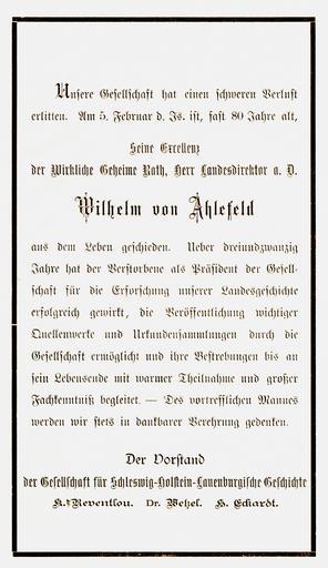| Keywords: Wilhelm von Ahlefeldt (1818-1897) 03.jpg de Todesanzeige für Carl Wilhelm von Ahlefeld t 1818-1897 Herr auf Treuholz und Wirklicher Geheimer Rat Landesdirektor Mitglied der Regierung in Plön und Klosterprobst von Uetersen own reproduktion original photo is more than 100 years old Umbekannt 1897 PD-old Wilhelm von Ahlefeldt 1818 “1897 Death notice |