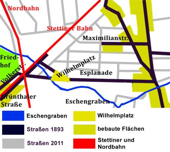 Keywords: Wilhelmplatz1893.png de Die Lage des Wilhelmplatzes in Berlin Pankow um 1890 Gezeichnet nach der Beilage zum Berliner Adressbuch von 1893 Plan von Berlin mit sämtlichen Vororten und vollständiger Stadt- und Ringbahn bearbeitet und herausgegeben von Julius Straube Geographisches Institut und Landkartenverlag Julius Straube Berlin SW Gitschinerstraße 109 Die hinterlegten Straßen in grau geben die Lage der Straßen im Tiroler Viertel von Pankow und dem angrenzenden Gebiet wieder ungefähre Lage nach dem Berliner Stadtplan e Rot Stettiner und Nordbahn Blau Eschengraben Grün Friedhof der Sophiengemeinde Das damals bereits bebaute Gelände ist in grüngelb dargestellt ANzumerken die Maximilianstraße geht nur im Beginn der heutigen Maximilianstraße in das unbebaute Gelände hinein Westlich der Bahnstrecken ist entlang der Volkerstraße und der Grünthaler Straße im heutigen Gesundbrunnen das Gelände bereits bebaut own Boonekamp 2011-11-20 52 33 29 20 N 13 24 13 24 E region DE-BE_heading 015 Cc-zero Esplanade Berlin-Pankow |