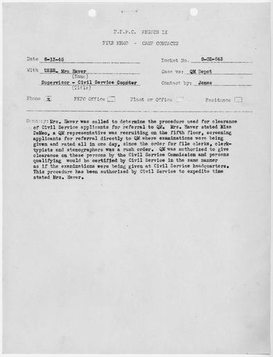 | Keywords: Willa D. Mosley, et al (Case 9-GR-543), File Memo - Case Contacts - NARA - 292189.tif Scope and content Summarizes continuing work on the case General notes 292189 Local identifier Office for Emergency Management Committee on Fair Employment Practice Division of Field Operations Region IX 11/11/1943 - 06/28/1946 NARA's Central Plains Region Kansas City NREA 400 West Pershing Road Kansas City MO 64108 1945-06-13 Record group Record Group 228 Records of the Committee on Fair Employment Practice 1940 - 1946 Record group ARC 555 Kansas City Quartermaster Depot Closed Case Files compiled 01/1945 - 08/1945 Series ARC 292151 File unit Willa D Mosley et al Case 9-GR-543 06/13/1945 - 08/21/1945 File unit ARC 292182 Variant control numbers NAIL Control Number NRE-228-REG9CRCFKCQD-FF-7 yes Other versions NARA-cooperation PD-USGov Employment discrimination in the United States |